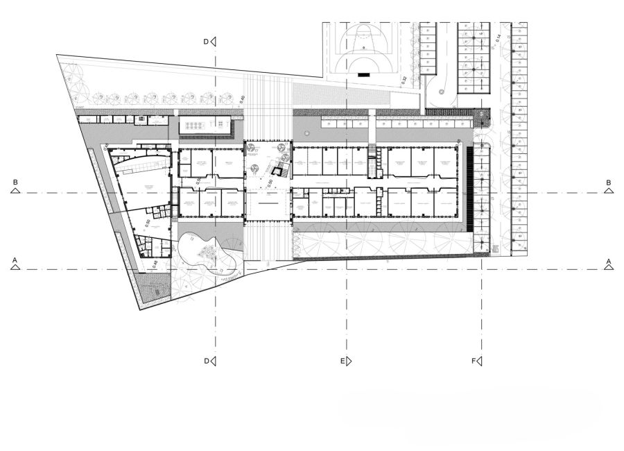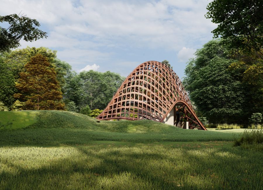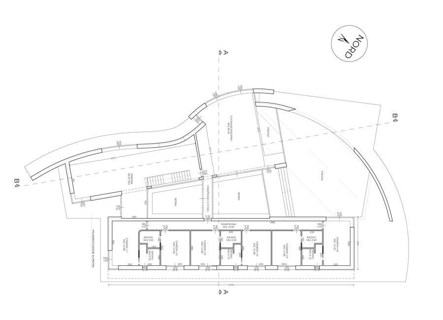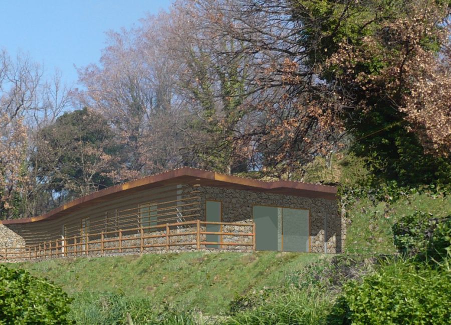 Per questo abbiamo pensato ad un fabbricato completamente autonomo, come esempio di edificio sostenibile ed integrato nel territorio. Una costruzione di un solo piano fuori terra con una copertura verde, tale da mimetizzarsi con la collina, quasi fosse un gradone.